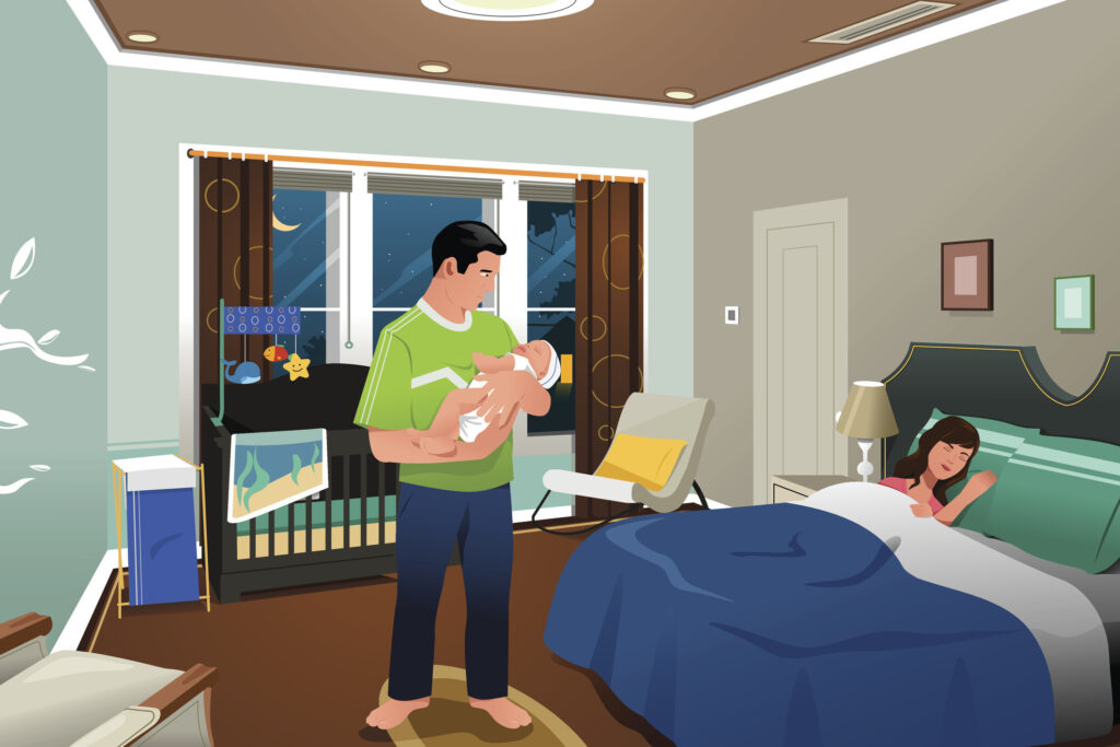 According to the American Academy of Pediatrics (AAP), the best place for a baby to sleep is in his parents’ bedroom. He should sleep in his own crib or bassinet (or in a co-sleeper safely attached to the bed), but shouldn’t be in his own room until he is at least 6 months, better 12 months. This is because studies have shown that when babies are close by, it can help reduce the risk of Sudden Infant Death Syndrome, or SIDS.